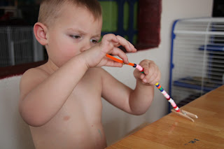 Another new activity for us today was a little bead play. I put a clothes pin on the end of a pipe cleaner so that he could string beads on to it and it would stand on its own. This was something that we hadn't done before either and I enjoyed watching his little hands string the beads. He caught on to it very quickly.